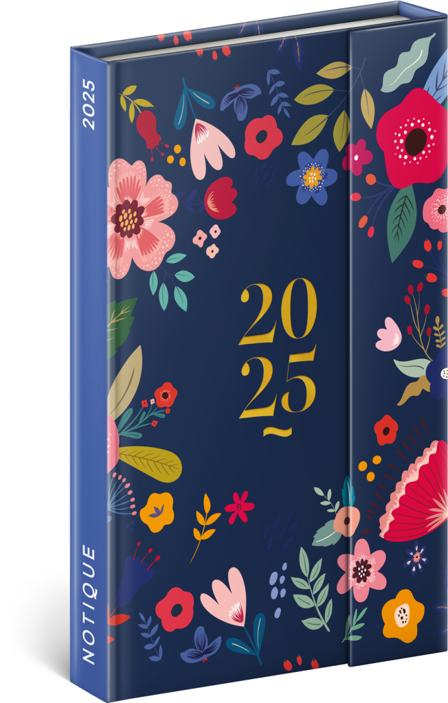 Diář 2025: Modré květy - týdenní, magnetický, 13 × 21 cm