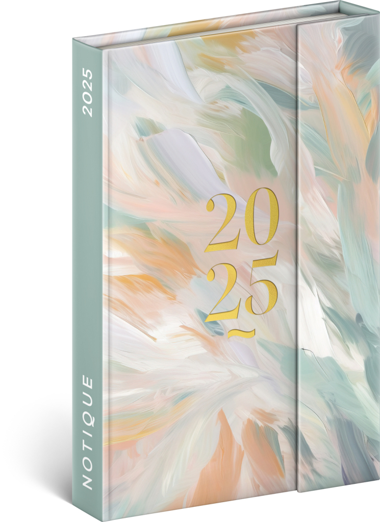 Šestijazyčný týdenní diář s magnetickým uzavíráním obsahuje přehled mezinárodních svátků, seznam českých a slovenských jmen, přehled roku 2025 a 2026, dodatečné stránky na poznámky a kapsičku na zadní předsádce. Sloupcové rozvržení s prostorem pro poznámky na každý den. Diář je v atraktivním designu s motivem abstraktní malby.