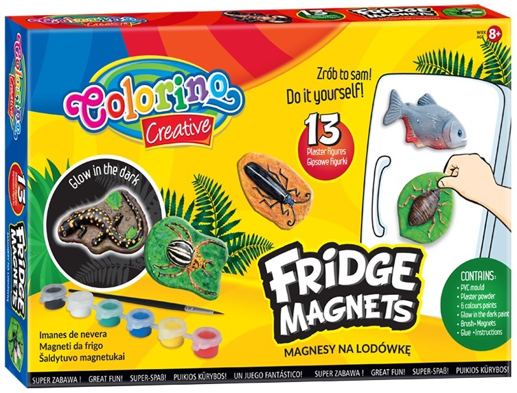 Gipsowe Magnesy Wyjątkowy, przyrodniczy pakiet do tworzenia gipsowych magnesów na lodówkę. Daj się ponieść wyobraźni i twórz niepowtarzalne, świecące w ciemności stworzenia. Zestaw zawiera: - formę do gipsu - gips - 6 farb - pędzelek - farbę świecąca w ciemności - magnesy - instrukcję