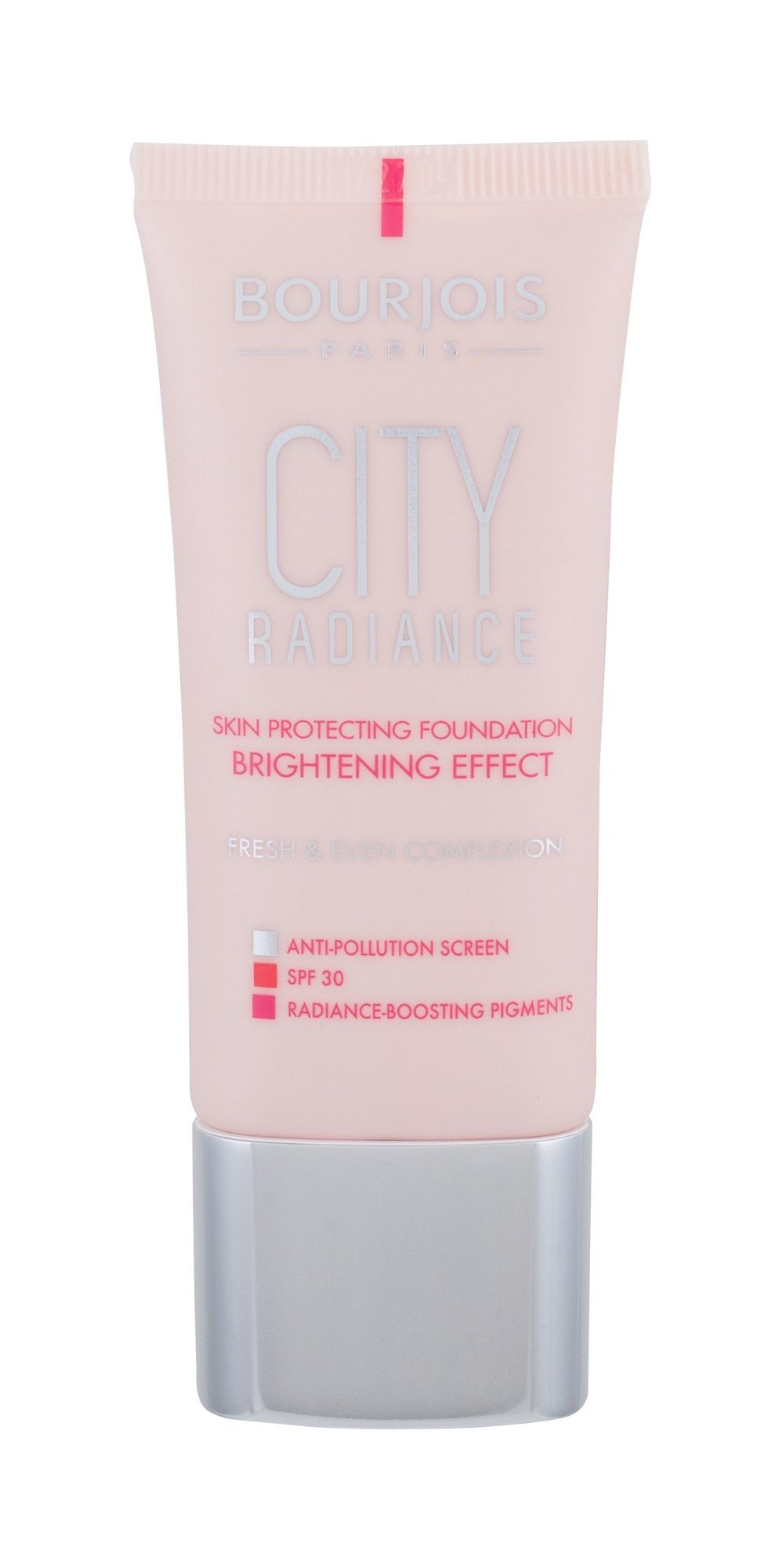 Make-up **BOURJOIS Paris City Radiance Foundation SPF30**. Make-up BOURJOIS Paris City Radiance Foundation SPF30 okamžitě rozjasňuje pleť a sjednocuje její tón. Jemná konzistence neucpává póry a nechává pleť volně dýchat. Složení obsahuje hydratační složky, které pleť optimálně hydratují během celého dne. Ochranný faktor SPF30 chrání pleť před škodlivými vlivy prostředí a slunečním zářením. Po použití bude Vaše pleť rozjasněná, sjednocená a svěží. **Poznámka**: _Vyobrazený odstín může být spíše orientační, záleží na nastavení barev Vašeho monitoru._