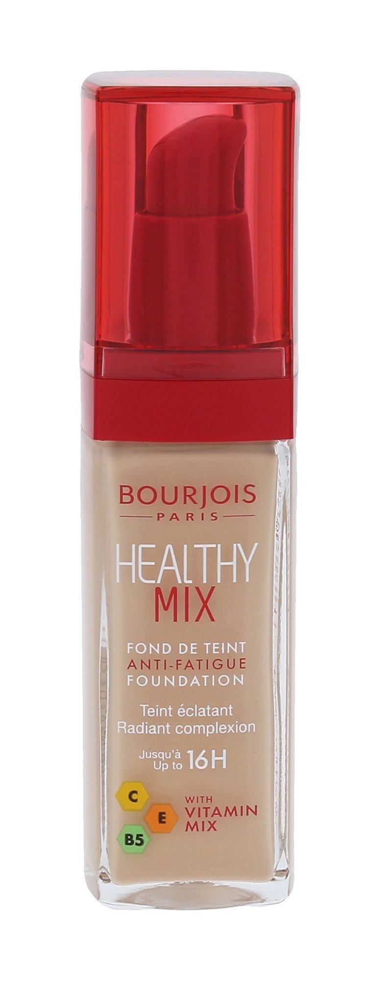 Tekutý makeup **BOURJOIS Paris Healthy Mix Anti-Fatigue Foundation**. Tekutý makeup BOURJOIS Paris Healthy Mix Anti-Fatigue Foundation perfektně sjednotí pleť a dodá jí sametový vzhled. Obsahuje výtažky jablka, melounu, meruňky a vitamíny C, E a B5, které pomáhají pleť vyživovat a hydratovat. Zároveň ji chrání před škodlivými vnějšími vlivy. Makeup BOURJOIS Paris Healthy Mix Anti-Fatigue Foundation redukuje otoky a další nedokonalosti pleti. Okamžitě pleť rozjasňuje a dodává jí svěží a mladistvý vzhled. **Poznámka**: *Vyobrazený odstín může být spíše orientační, záleží na nastavení barev Vašeho monitoru.*