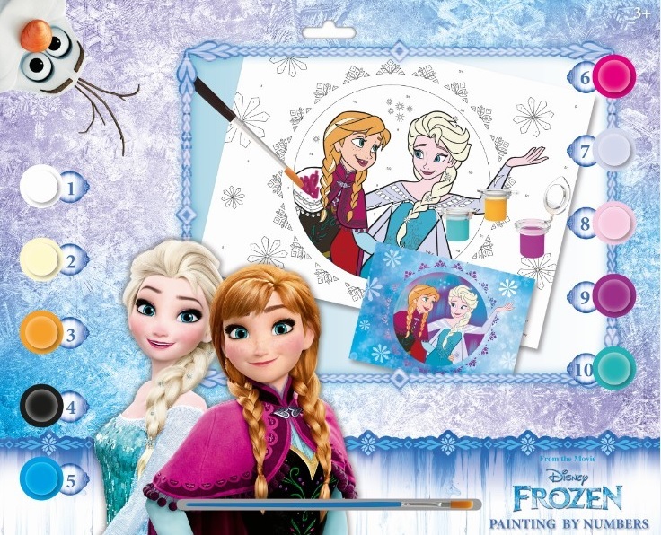 Balení obsahuje 10 akrylových barev v kalíšku, obrázek na imitaci plátna, obrázek k vybarvení nanečisto a štětec.