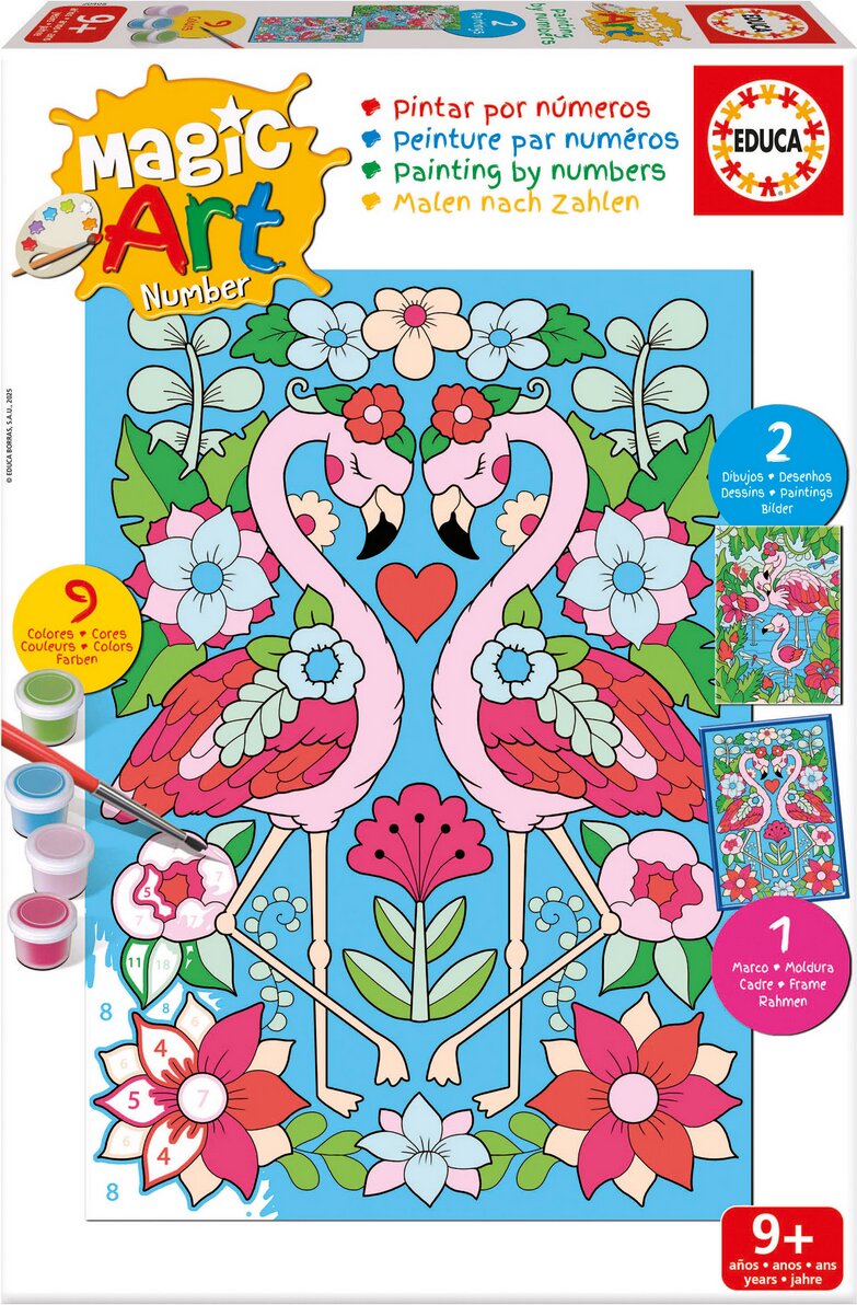 Balení obsahuje: 2 obrázky o rozměru 20,5 x 15,5 cm s očíslovanými částmi, barevnou předlohu, sadu 9 barev se stojánkem, plastový rámeček na postavení a štětec.