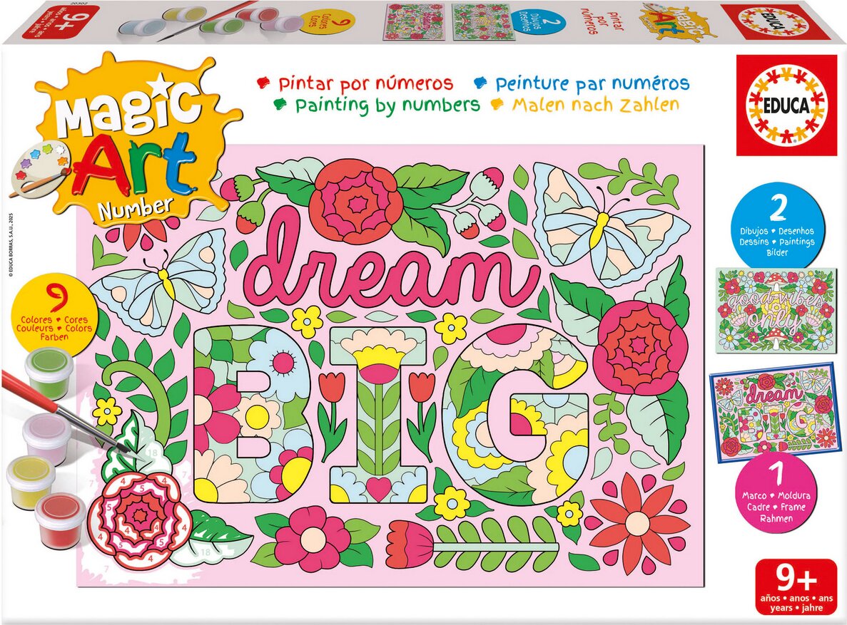 Balení obsahuje: 2 obrázky o rozměru 20,5 x 15,5 cm s očíslovanými částmi, barevnou předlohu, sadu 9 barev se stojánkem, plastový rámeček na postavení a štětec.