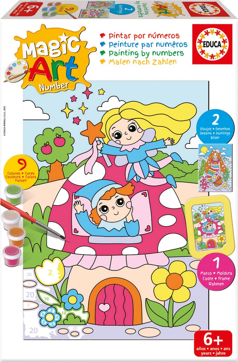 Balení obsahuje: 2 obrázky o rozměru 20,5 x 15,5 cm s očíslovanými částmi, barevnou předlohu, sadu 9 barev se stojánkem, plastový rámeček na postavení a štětec.