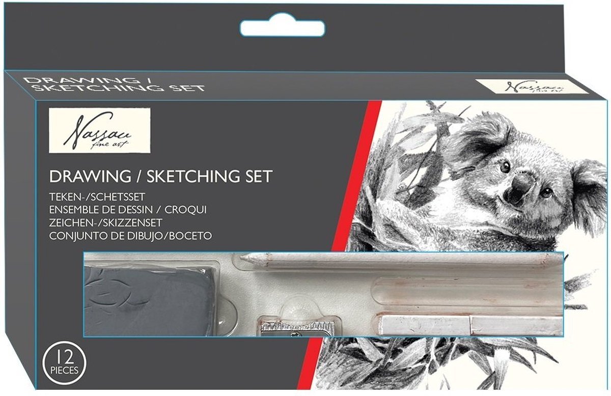 Sada obsahuje: 3x pastelové křídy( bílá, okrová, hnědá), 3x jemné pastelové tužky, 1x uhlová tužka bez dřeva,1x uhlová tužka( střední), 1x skicovací tužka (2B), 1x ořezávátko, 1x guma na hnětení, 1x papírový pahýl.
