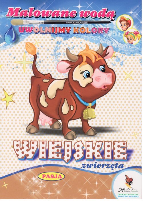 Wystarczy kubek z wodą i pędzelek, a dziecko pozna świat kolorów zwilżając kartki tej kolorowanki. 10 ilustracji, raster kolorowy.