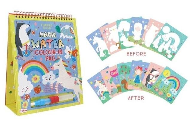 Kolorowanka wodna z pisakiem i podpórką to świetna zabawa dla najmłodszych. Wystarczy napełnić pisak wodą i zachęcić dziecko do kreatywnej zabawy, aby zobaczyć, jak kolory i kształty magicznie się pojawiają, a po wyschnięciu znikają. Dziecko będzie się świetnie bawić, odkrywając bajecznie kolorowe wróżki, jednorożce, motyle, tęcze i nie tylko. Sześć zabawnych kart jest połączonych w spiralnie oprawionej okładce, dzięki czemu można je odwracać po ukończeniu. Podpórka wygodnie podtrzymuje karty wielokrotnego użytku. Po zakończeniu zabawy wystarczy złożyć podpórkę, a dzięki elastycznej gumce pisak zawsze będzie na swoim miejscu.
