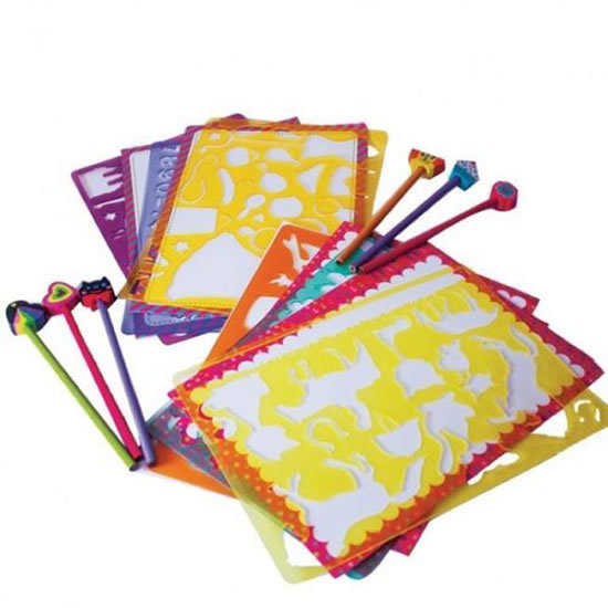 Sada kreslicích šablon a kreslicích potřeb pro malou výtvarnici v rozkládacím úložném pouzdru s držadlem pro snadné přenášení. Díky praktickému pouzdru můžete sadu vzít s sebou kamkoli a zabavit tak vaše dítě i na cestách, v restauraci, na dovolené apod. Sada obsahuje 6 kreslicích šablon se 150 motivy, 20 listů ozdobných papírů a 6 barevných pastelek s 6 mazacími gumami originálních tvarů a barev. Vhodné od 3 let.