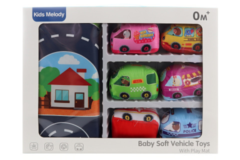 Baby dopravní sada obsahuje koberec a 6 dopravních prostředků. Koberec zároveň slouží jako taška pro přemístění. Materiál polyester. Baleno v krabici. Rozměry balení 35,5x27x8,5 cm. Velikost dopravního prostředku cca 9 cm. Věk 0+