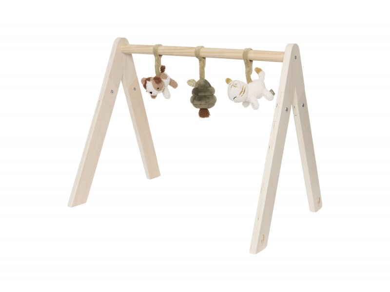 Sada tří měkkých závěsných hraček je určena pro zavěšení na dřevěnou hrazdičku (hrazda není součástí výrobku). Díky poutku na suchý zip je můžete zavěsit i na autosedačku, postýlku či kočárek. Hračky lákají dítě k pozorování a zkoumání a podporují tak rozvoj hmatu, zraku i koordinace pohybů miminka.