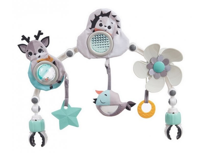 Součástí hrazdy jsou různé aktivity jako chrastítko, kousátko, otáčecí větrník i bezpečné zrcátko, které dítě nejen zabaví, ale i rozvíjí jeho smysly a motorické schopnosti. Připevníte ji jednoduše k většině kočárků, autosedaček či lehátek pomocí praktických plastových klipsů a díky nastavitelnému sklonu hrazdy ji můžete přizpůsobit přesně podle potřeby.