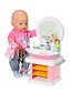 Nejprve rozsviť světlo, aby se na sebe malý ušmudlánek mohl podívat. Stačí zmáčknout růžové tlačítko a okraj zrcadla se rozsvítí a rozezní se melodie. Jak dlouho si ještě musím mýt ruce? Odpověď je snadná! Stiskni dávkovač mýdla a myj si ruce tak dlouho, dokud bude hrát písnička! Výborně! Špunt ve tvaru kačenky umyvadlo utěsní. Pak do něj můžeš napustit opravdovou vodu. Voda poteče, když budeš opakovaně tisknout kohoutek. A když se špunt vytáhne, zmizí voda do odtokové trubky. Nyní je čas osušit si ruce a vyčistit si zuby žlutým kartáčkem. Po vyjmutí modrého kelímku z držátka uslyšíš zvuky jako při čištění zubů. S tímto bílo-růžovým umyvadlem je osobní hygiena opravdová zábava! • Kvalitní příslušenství pro originální panenku BABY born. • Pro radost z nápadité, rozmanité a dlouhotrvající hry. • Funguje na baterie (nejsou součástí). BABY born Umyvadlo se světelnými a zvukovými efekty. Součástí je zubní kartáček, kelímek, dávkovač mýdla, špunt ve tvaru kačenky a ručník.