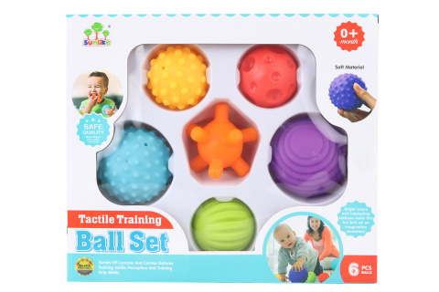 Sada obsahuje kvalitní gumové míčky, které jsou příjemné na dotek a bezpečné i pro nejmenší děti od narození. Každý míček má rozměr přibližně 6,5 x 6,5 cm a díky pestré barevnosti a různým tvarům podporuje rozvoj hmatového vnímání, koordinace a představivosti dítěte. Celé balení má kompaktní rozměr, který usnadňuje skladování i přenášení.