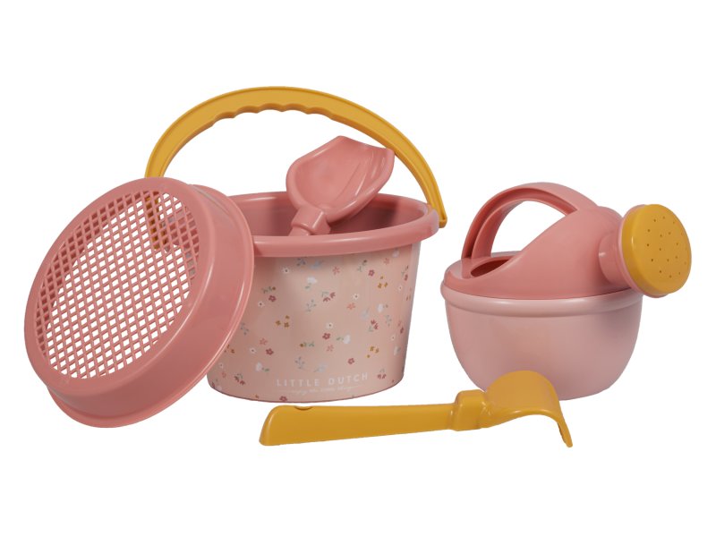 Sada na písek s krásným květinovým potiskem se bude dětem hodit doma na zahradě i u moře na pláži. Sadu tvoří kyblík, konvička, hrabičky, lopatka a sítko v kvalitním provedení z pevného plastu.