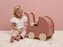 Kočárek je díky kvalitní dřevěné konstrukci velmi stabilní. Kolečka mají po obvodu gumové kroužky, které zabrání poškrábání podlahy a umožňují nehlučnou jízdu.