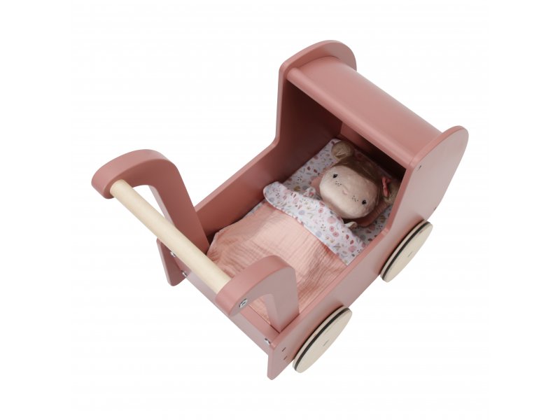 Retro kočárek v krásném dřevěném provedení s měkkou textilní panenkou je vybaven peřinkou, polštářkem a matrací. Díky své velikosti kočárek slouží i jako chodítko, které pomůže dítěti při jeho prvních krůčcích. Jízda s kočárkem podporuje rozvoj rovnováhy, koordinace a motoriky dítěte.