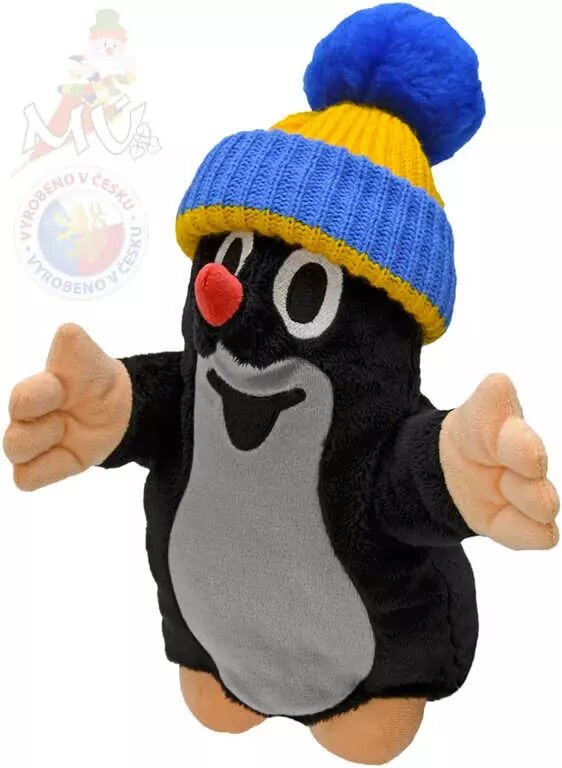 Plyšový maňásek Krteček mírně vycpaný, se sundavací čepicí číst celé