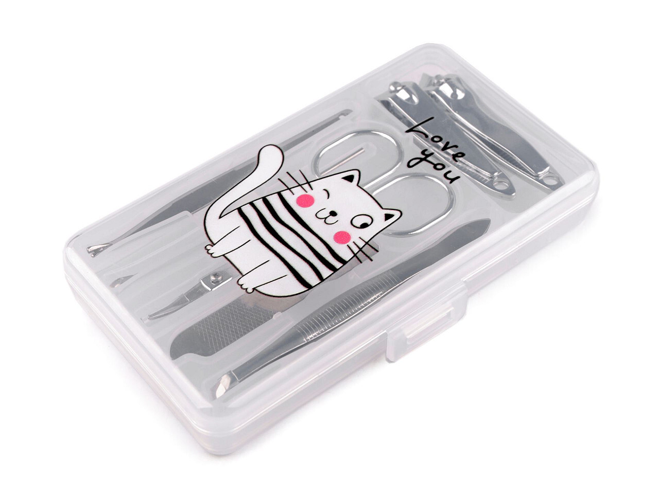 Manikúra v plastovém pouzdře s potiskem kočky potěší každou ženu či dívku. Je praktická, pohodlně se vejde do kabelky, hodí se i na cestování.Manikúra obsahuje: nehtové nůžky, pilník, sešikmenou pinzetu, 2 manikúrní nástroje a 2 kusy nehtových kleští.