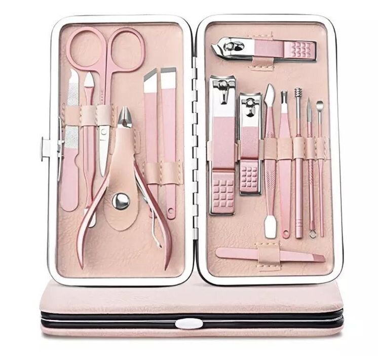 Profesionální manikúra v luxusním koženkovém pouzdře obsahuje 15 nástrojů v růžové barvě s matovou úpravou. Všechny nástroje jsou zhotoveny z tvrdé a odolné nerezové oceli, byly pečlivě nabroušeny. Najdete zde profesionální nástroje pro manikúru a pedikúru stejně jako ostatní nepostradatelné pomůcky v péči o pleť a obočí.