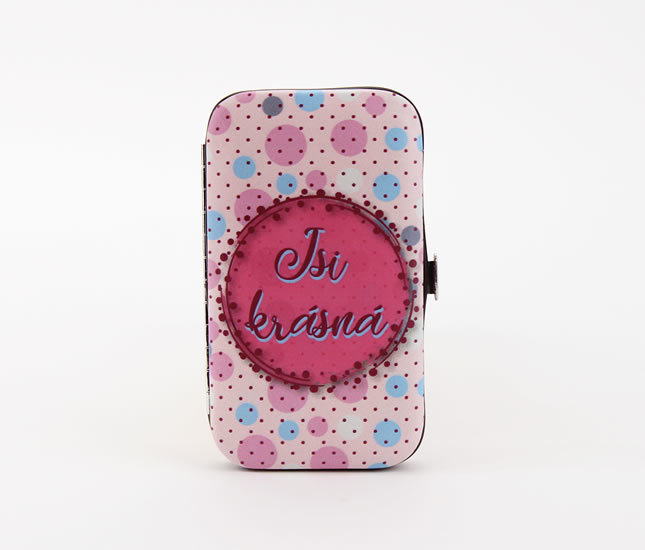 Kompaktní manikúra v pevném pouzdru s designem Happy Spirit je pro mladé dámy důležitým pomocníkem. Pečujte o sebe a mějte v kabelce či batůžku to důležité! Manikúra obsahuje: nůžky, dvoje kleštičky na nehty, kovový pilník, pinzetu a další užitečné nástroje. Povrch pouzdra je jemný na dotek, s praktickým zavíráním. Materiál: pouzdro 100% polyuretan nástroje nerezová ocel Rozměr: 60 *110 mm