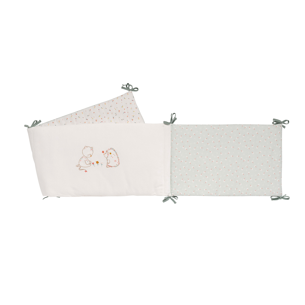 Ochranný mantinel do postieľky s krásnymi aplikáciami zabraňuje nárazom dieťaťa do bokov postele a vytvára útulné a bezpečné prostredie na spanie. Šnúrky pomáhajú jednoduchému priviazaniu k postieľke.