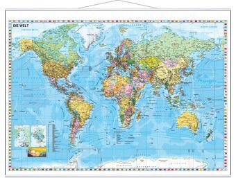 Stiefel Wandkarte Großformat Weltkarte politisch mit Flaggenrand, deutschsprachig, mit Metallstäben (německy)