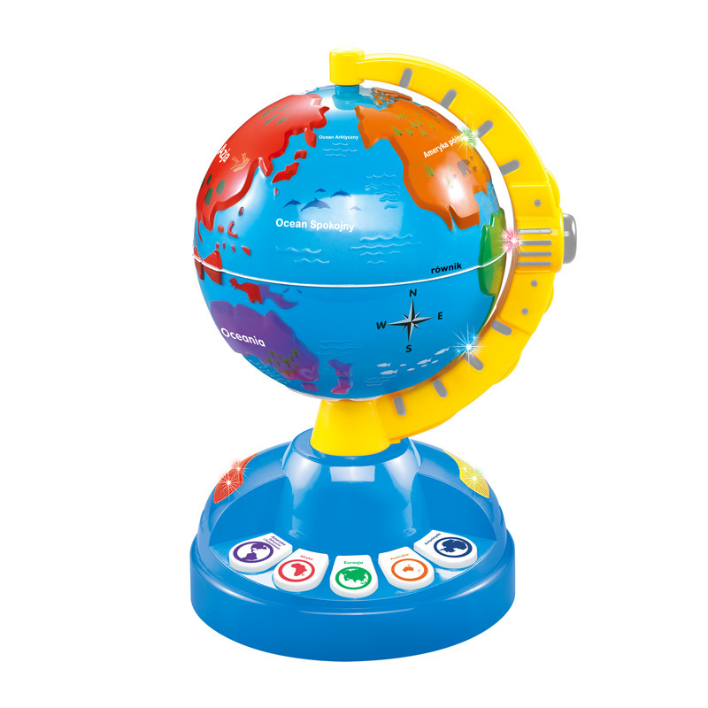 Interaktywny globus z którym możemy się wybrać w podróż dookoła świata.Globus posiada 5 klawiszy funkcyjnych:Ameryka Północna i Południowa,Afryka,Eurazja,Australia,Antarktyda.Naciśnij jeden z klawiszy, a zabawka opowie o wskazanym kontynencie.Globus obraca się w trakcie zabawy.Poznaj ciekawe obiekty na Ziemi: Statua Wolności, Statua Chrystusa Zbawiciela, Czeczen Itza, Machu Picchu,Piramidy w Europie, Wieża Eiffla, Big Ben, Krzywa wieża w Pizie, Plac Czerwony i wiele innych.Zabawka wymaga użycia baterii: 4x AA-1,5V(nie dołączono).Wymiary opakowania: 20x34x20cm.Wiek: 3+.