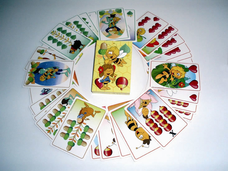 Dětské hrací karty na pohádkové motivy se zachováním symbolů (žaludy, zelené ...) a návodem k jedné z možných her - Prší. číst celé