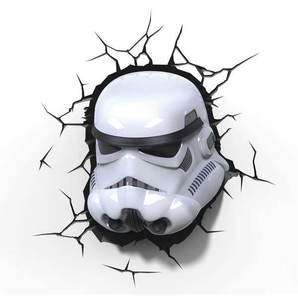 3D světlo v podobě masky Storm Troopera.Světlo v podobě masky Storm Troopera je luxusní dekorace na zeď. Světlo potěší nejen děti v jejich pokojíčku, ale i dospělé fanoušky Star Wars, kteří si tak mohou zútulnit interiér. Balení obsahuje i samolepky, které na zdi vytvoří popraskaný vzhled.