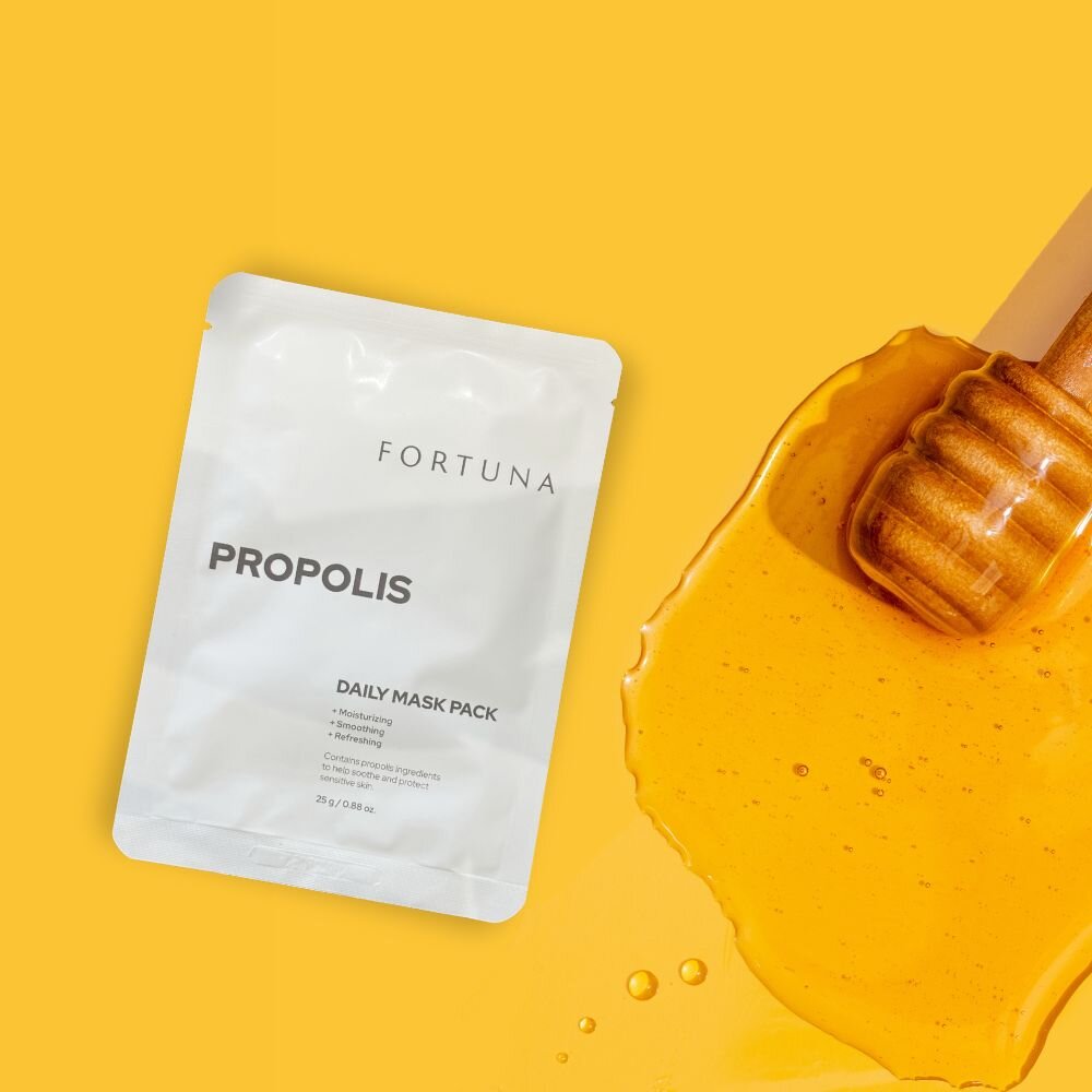 Zklidňuje podrážděnou pokožku. Vhodné pro problematickou a podrážděnou pleť. Není vhodné pro alergiky. Zažijte kouzlo propolisu s FORTUNA Propolisovou plátynkovou maskou, která okamžitě zklidní podrážděnou pokožku. Ideální volba pro problematickou a citlivou pleť, která potřebuje extra péči a regeneraci. Zklidňuje a regeneruje : Skvělá pro citlivou a podrážděnou pleť. Všestranné účinky : Zjemňuje, hydratuje a vyživuje pokožku. Luxusní péče : Poskytuje pleti péči s viditelnými výsledky po prvním použití. Duální funkční kosmetická certifikace : Proti vráskám a pro rozzáření pleti. OEKO-TEX 1. stupně : Speciální bavlna vhodná i pro nejcitlivější pokožku. Obsahuje celou řadu účinných látek: extrakt z propolisu, madecassosid, niacinamid, med, kyselina hyaluronová, adenosin. Výsledkem bude zklidněná, rozzářená, hydratovaná pleť. Navíc jemné linky a vrásky budou méně vyditelné. Náš tip: Pokud Vám maska bude vyhovovat, kupte si balení po 10 ks. Nejen že je výhodnější, ale budete mít svou oblíbenou masku po ruce kdykoliv bude potřeba.