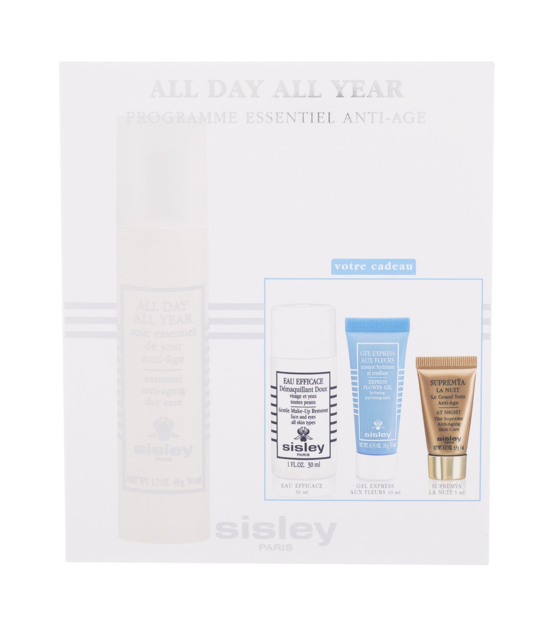 Sisley All Day All Year denní pleťový krém All Day All Year Essential Anti-Aging Day Care 50 ml + pleťová maska Express Flower Gel Hydrating and Toning Mask 10 ml + noční pleťový krém Supremya At Night Anti-Aging Skin Care 5 ml + odličovací přípravek Eau