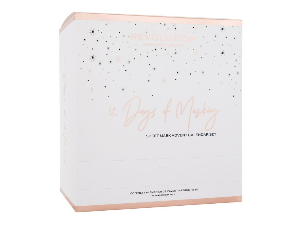 Revolution Skincare 12 Days Of Masking textilní pleťová maska 8 ks + maska na rty 1 ks + maska na ruce 1 ks + polštářky pod oči 1 ks + masážní váleček na obličej