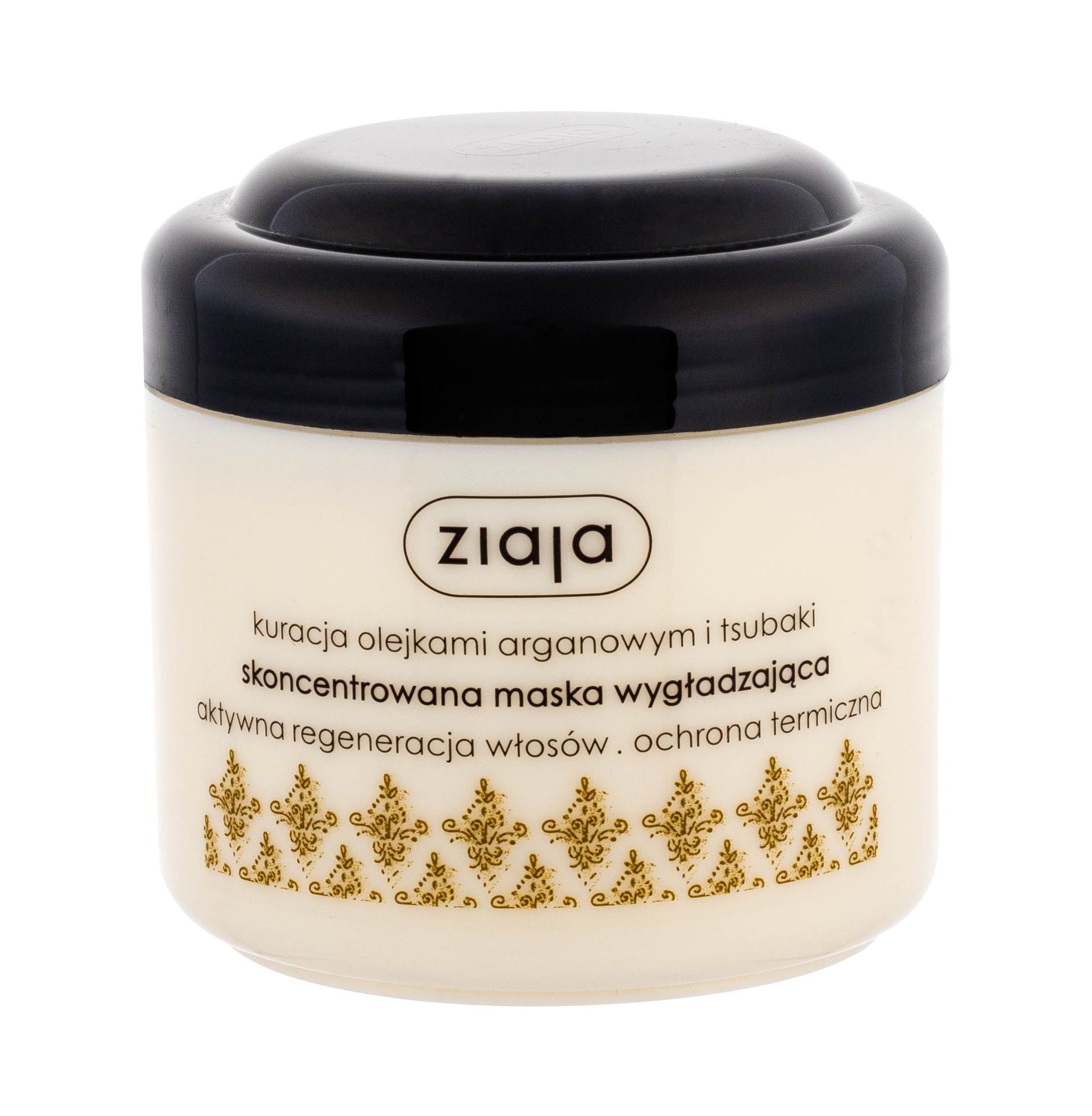 Vyhlazující maska na vlasy **Ziaja Argan & Tsubaki Oils.** Maska na vlasy díky arganovému a tsubaki oleji dodává poškozeným vlasům, zničených po častých kadeřnických úpravách, hloubkovou výživu. Intenzivně regeneruje narušené vlasové vlákno. Uhlazuje vlasy. Zabraňuje jejich vysušování. S pravidelným používáním masky z řady Argan Oil budou Vaše vlasy lesklé, uhlazené a zdravé na pohled. **Použití:** Aplikujte do ručníkem vysušených vlasů. Nechte působit 3 - 5 minut. Důkladně opláchněte.