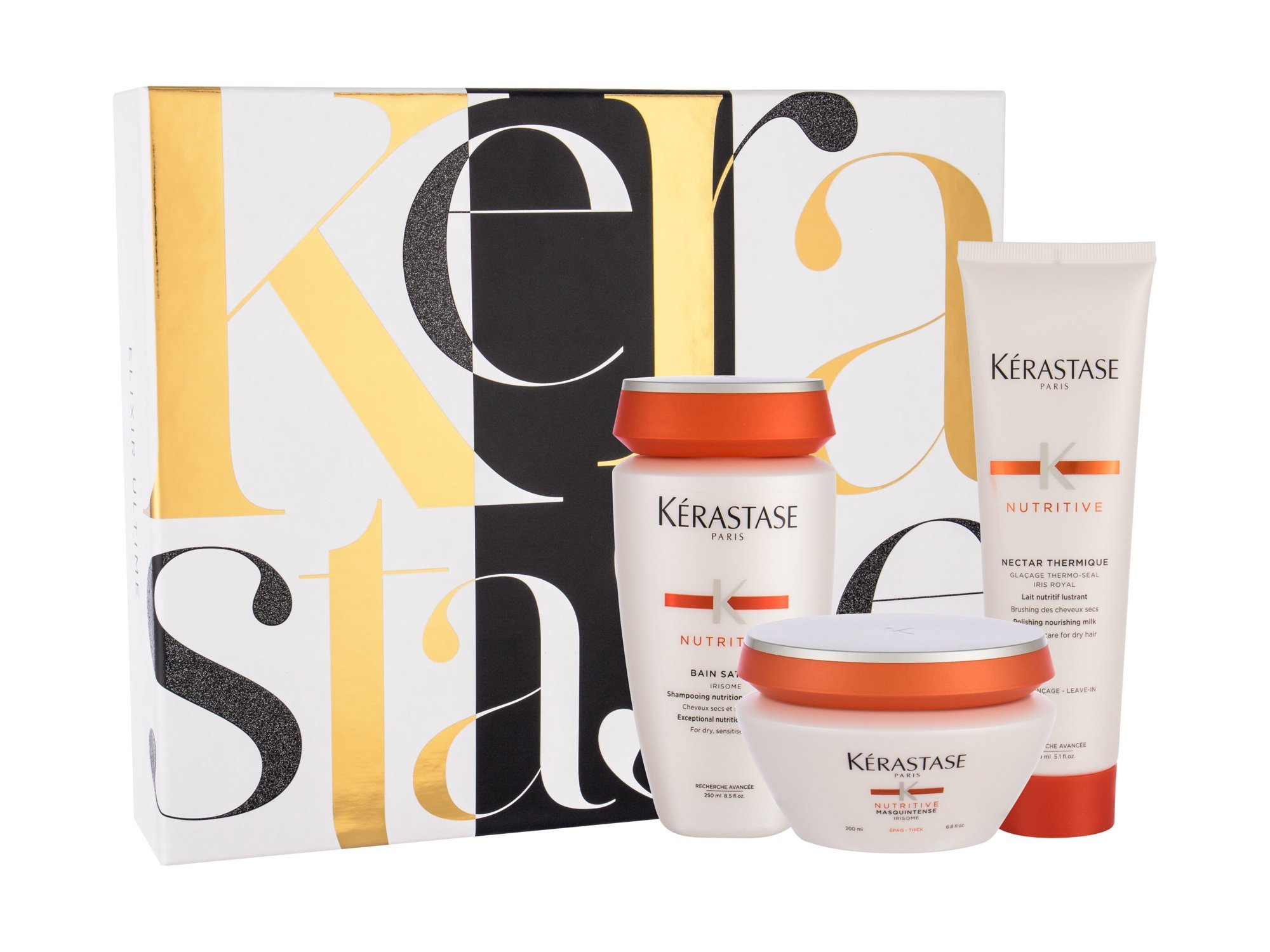 Sada pro péči o suché vlasy **Kérastase Nutritive.** **Složení kazety:** Šampon s kompletní výživou pro suché vlasy **Kerastase NutritiveBain Satin 2 Irisome 250 ml**. Pro dlouhotrvající výživu a hydrataci vlasů. která působí jak na příčinu ztráty výživy vlasů - oxidaci, tak i na její důsledky - vysušování. Vyživuje a hydratuje vlasy, vyhlazuje vlasová vlákna. Obnovuje vlasy od kořínků po konečky. Zjemňuje vlasy a navrací jim lesk. **Použití**: Aplikujte na mokré vlasy a jemně masírujte. Při oplachování nanášejte postupně malé množství teplé vody a jemně emulgujte. Důkladně opláchněte. Aplikaci zopakujte dle potřeby. Maska na vlasy **Kerastase Nutritive Masquintense Irisome 200 ml**. Maska na vlasy Kerastase Nutritive Masquintense Irisome pro suché, extrémně citlivé a silné vlasy. Hloubkově vlasy vyživuje od kořínků až po konečky. Dokonale vlasy vyživuje a dodává jim oslnivý lesk. Lehké složení nezatěžuje vlasy. Dodává vlasům potřebnou výživu a lesk. Výsledkem jsou hebké a silné vlasy. **Použití**: Aplikujte na umyté vlasy. Nechte působit 5 minut a poté důkladně opláchněte Vyživující vlasová péče **Kerastase Nutritive Nectar Thermique Nourishing Milk 150 ml**. Vlasová péče Kerastase Nutritive Nectar Thermique Nourishing Milk dodá vlasům optimální lesk a hebkost. Hloubkově vlasy vyživuje od kořínků až po konečky. Chrání vlasy před mechanickým poškozením. Složení je obohacené o mateří kašičku, která vlasy intenzivně vyživuje. Po použití budou Vaše vlasy hebké, vyživené a chráněné. **Použití**: Aplikujte na umyté vlasy. Jemně vmasírujte a upravte jako obvykle. Neoplachujte.