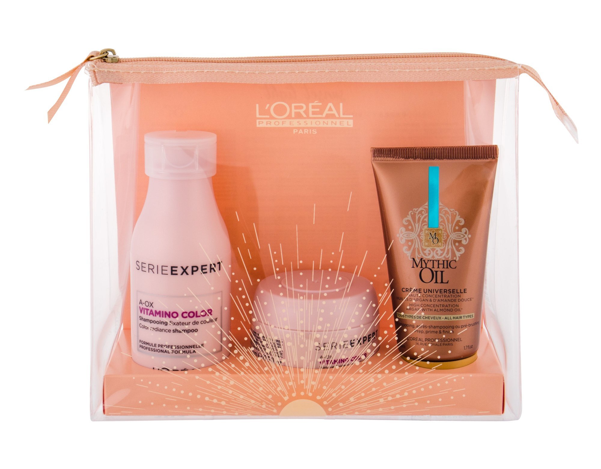 Dárková sada vlasové kosmetiky **L´Oréal Professionnel Série Expert Vitamino Color A-OX** pro péči o barvené vlasy. ### Co je součástí této sady? **Šampon pro barvené vlasy L´Oréal Paris Expert Vitamino Color A-OX 100 ml.** Šampon chrání barvu vlasů a zabraňuje jejímu vymývání. Bohaté složení s vitamíny dodává vlasům lesk, sílu a pružnost. Ochranné UV filtry chrání barvu před slunečním zářením. Šampon jemně čistí vlasy a vlasovou pokožku a dokonale odstraňuje veškeré nečistoty. Vlasy budou jemné a oslnivě lesklé. **Použití**: Aplikujte na mokré vlasy. Jemně vmasírujte a poté důkladně opláchněte. **Maska na vlasy L´Oréal Professionnel Série Expert Vitamino Color A-OX 75 ml.** Maska chrání barvu vlasů a dodává jí oslnivý lesk. Maska proniká hluboko do struktury vlasů a intenzivně vyživuje vlasová vlákna. Vaše barva tak zůstane déle zářivá. **Použití**: Aplikujte na vlhké vlasy. Nechte působit 1 minutu a poté důkladně opláchněte. **Víceúčelový krém na vlasy L´Oréal Professionnel Mythic Oil Creme Universelle 50 ml** Krém obsahuje přírodní oleje, které o vlasy intenzivně pečují. Pomáhá vlasy hydratovat a vyživovat. Zároveň chrání vlasy před teplem z fénu, kulmy nebo žehličky. Usnadňuje rozečesávání vlasů. Arganový a mandlový olej vlasy posiluje, chrání a regeneruje. Po použití budou vaše vlasy hebké, vyživené a chráněné před teplem. **Aktivní látky**: