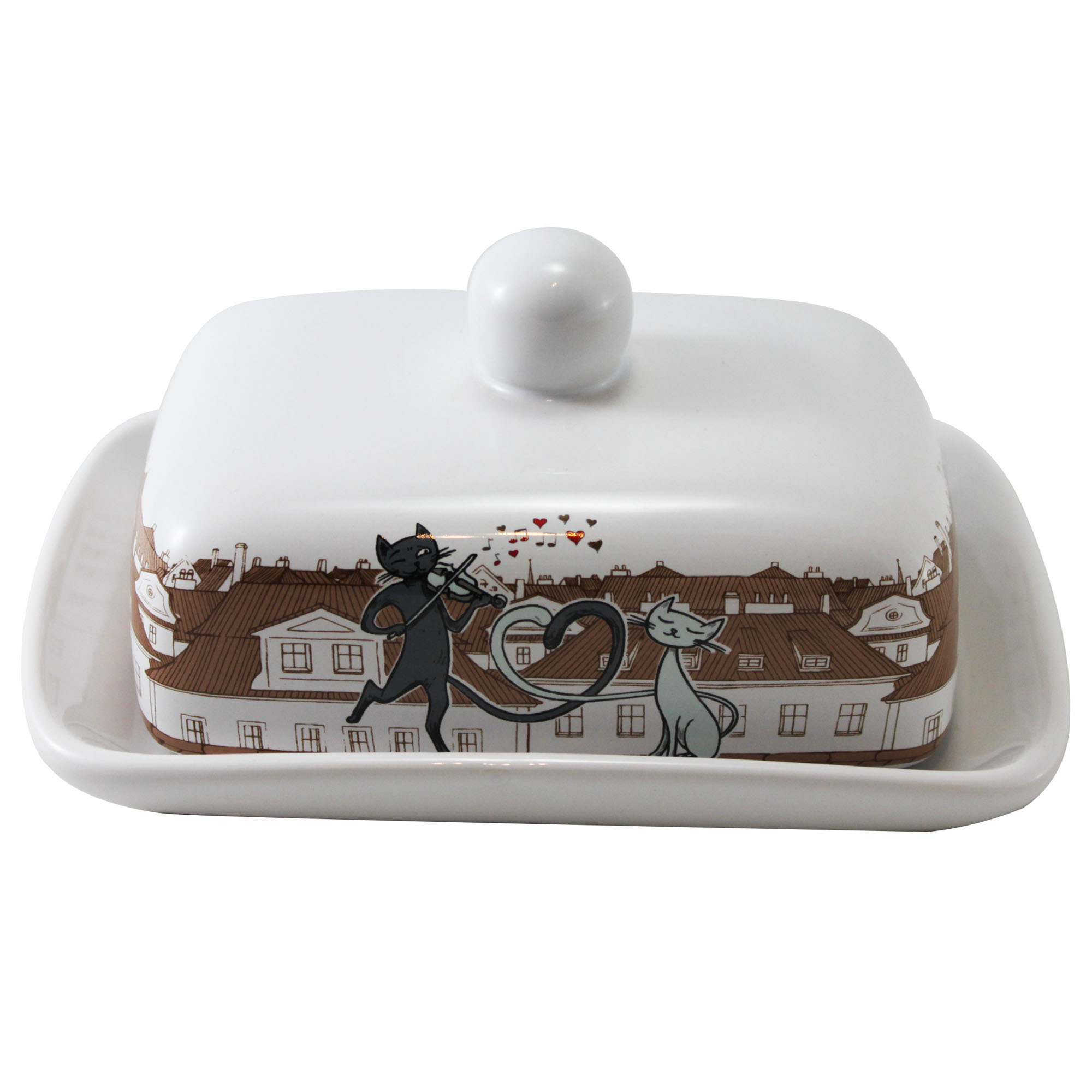 Máslenka s veselým motivem z kolekce Kočky ve měste. V našem eshopu nabízíme další porcelán a textil s tímto motivem, například stojan na ubrousky, konvičky, hrníčky, misky a mnoho dalšího. Vše můžete hravě kombinovat. Dodáváme v barevné kartonové krabičce.