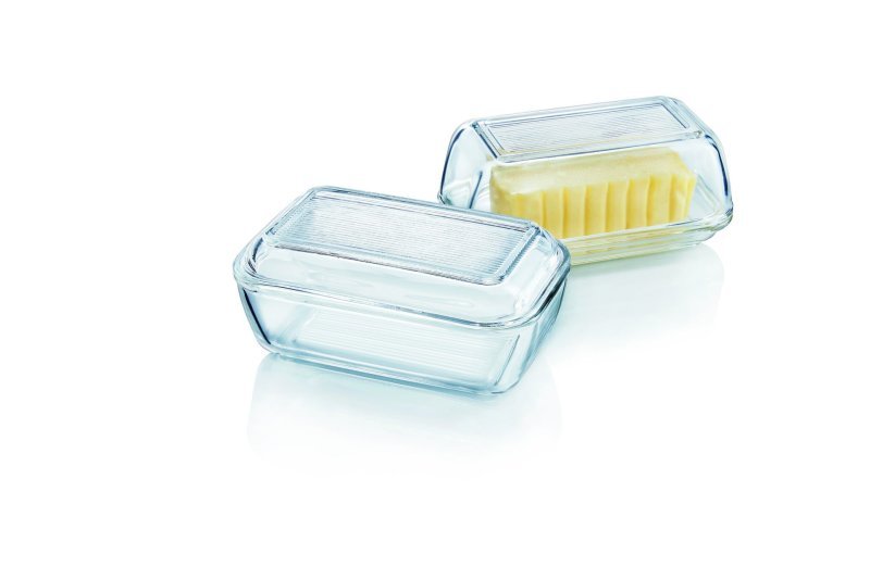 Skleněná máslenka od francouzského výrobce kvalitního skla. Dóza je z pevného, čirého skla. Z vnější strany je nahoře i dole dekorativní vroubkování. Máslo ve skle si zachová svoji čerstvost, chuť i vůni. S máslenkou na stole, pak bude každodenní stolování vypadat slavnostněji. Materiál - sklo. Rozměry - 17x11 cm, výška 7,5 cm.