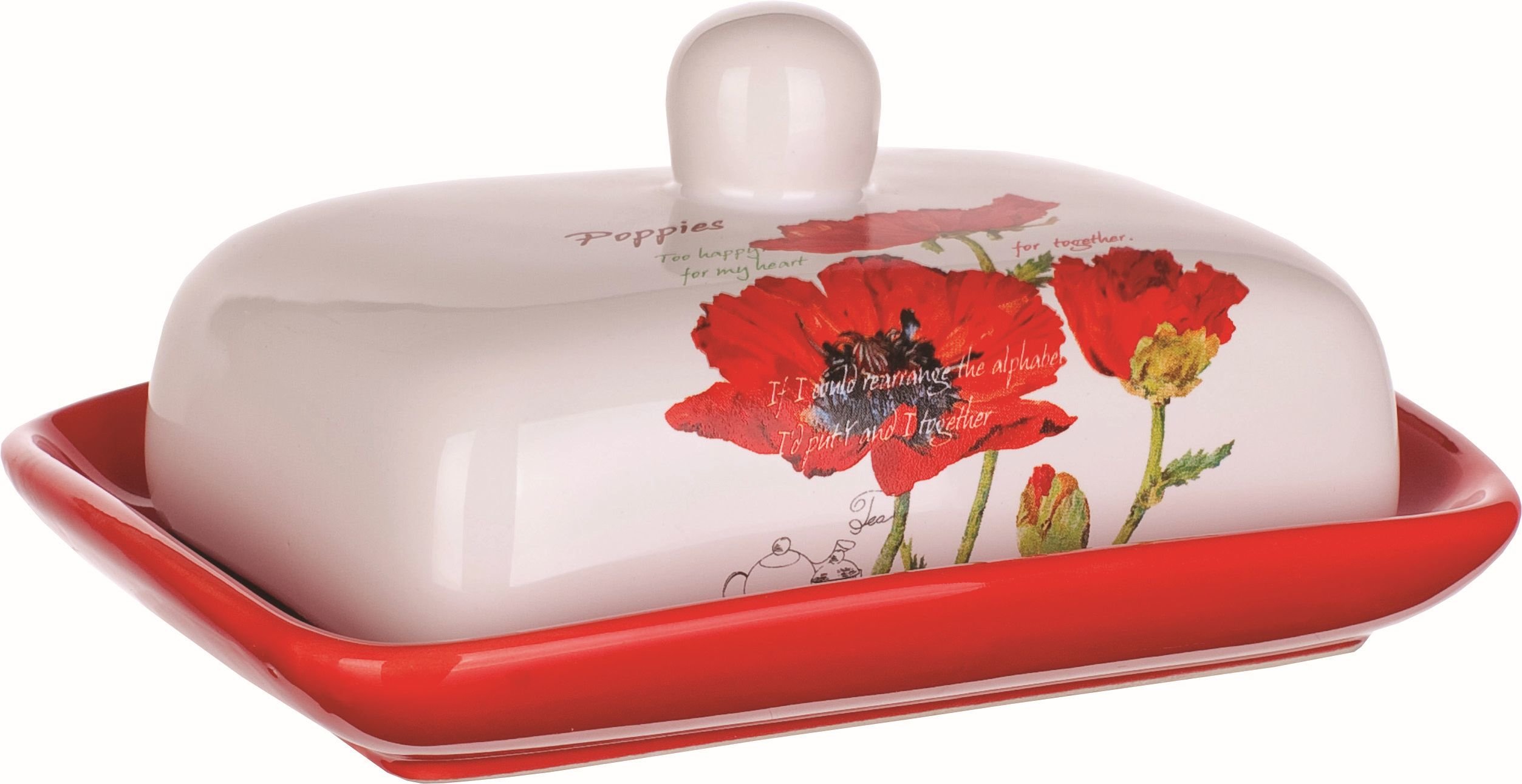 Máslenka RED POPPY, červeno-bílá glazura s dekorem vlčích máků. Doporučujeme mýt ručně. Materiál - keramika. Rozměry - délka 17,5cm, šířka 13cm, výška 8cm. číst celé