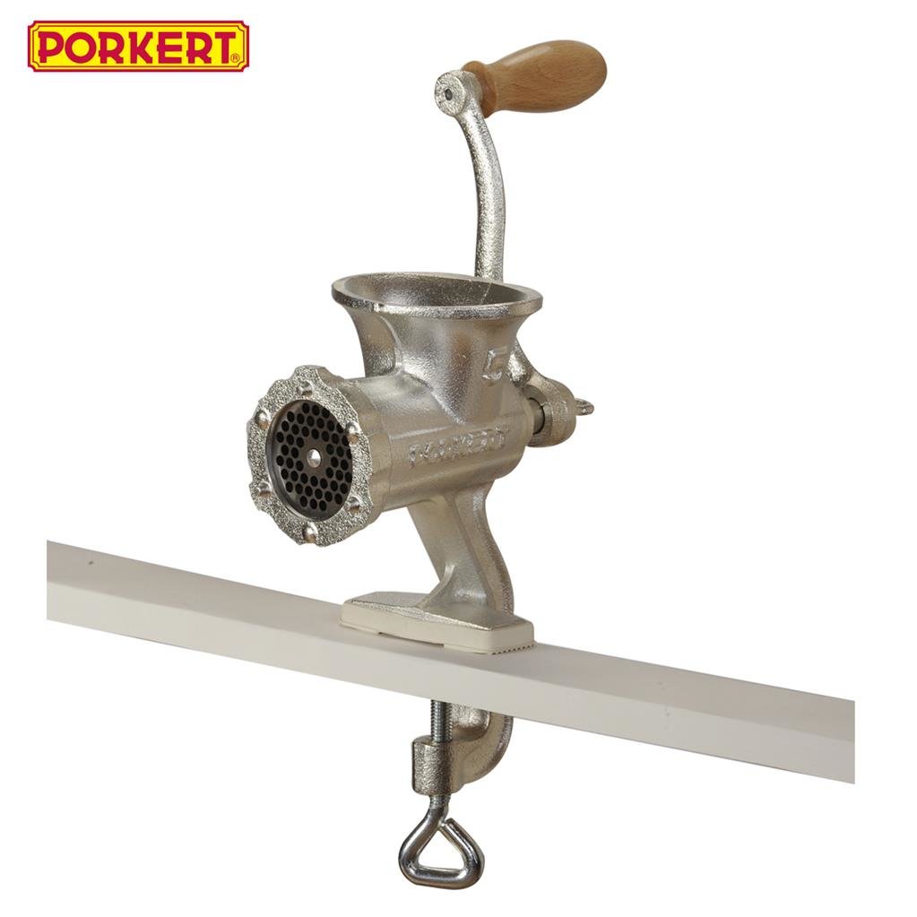Mlýnek na maso PORKERT pro přípravu sekané, karbanátků, masa na špagety a jiných pokrmů z mletého masa. Mlýnky mají certifikát zdravotní nezávadnosti, jsou povrchově upravené silnou vrstvou potravinářského cínu. Mimořádně vysoká životnost. Mletí je snadné a jednoduché. Veškeré díly jsou vyráběny v České republice. Ke stolu připevníte pomocí klasického šroubu. Gumová podložka zabrání poškození pracovní desky. Velikost 5. Snadná montáž a demontáž, jednoduchá údržba. Rozměry: celková výška od stolu 14 cm, násypka 9x7 cm, vhodný na desky do max. tl. 4 cm, pr. kolečka 6 cm, pr. otvorů 0,4 cm. Není vhodný do myčky na nádobí.