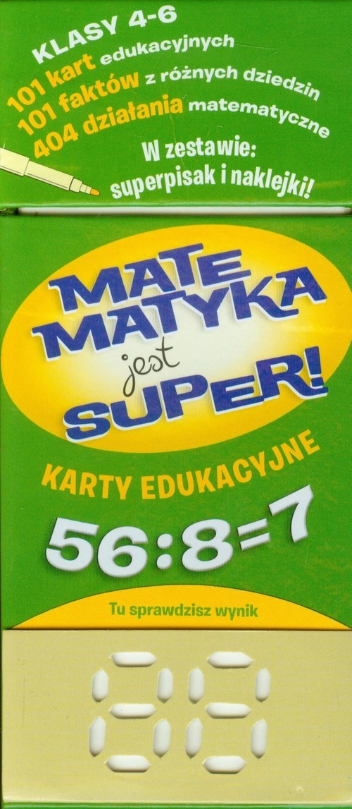 Z zestawem kart edukacyjnych MATEMATYKA JEST SUPER żadna klasówka nie będzie zbyt trudna! Graj, baw się i ucz przeglądając karty z działaniami matematycznymi i ciekawymi faktami. Dołączony superpisak pozwoli Ci łatwo wytrzeć błędną odpowiedź i spróbować jeszcze raz. Prawidłowy wynik pierwszego...