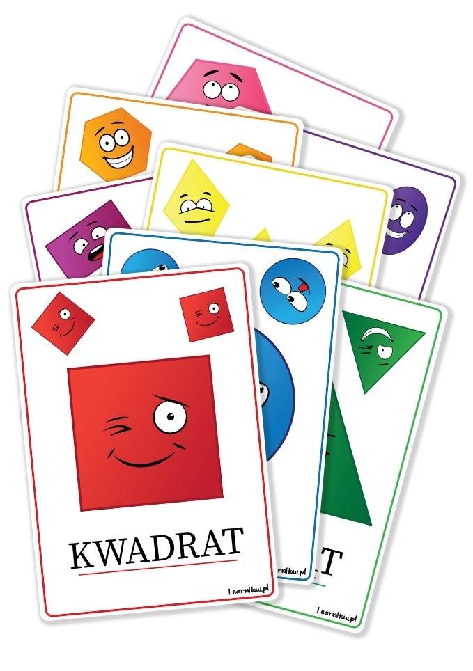 Zestaw dużych kolorowych plansz z figurami geometrycznymi z podpisami.Figury znajdujące się na ilustracjach: Kwadrat, Koło, Prostokąt, Trójkąt, Owal, Wielokąt, Trapez, Romb.Plansze wydrukowane na papierze: 300g oraz zafoliowane dwustronnie, rogi zaokrąglone dla bezpieczeństwa oraz komfortu...