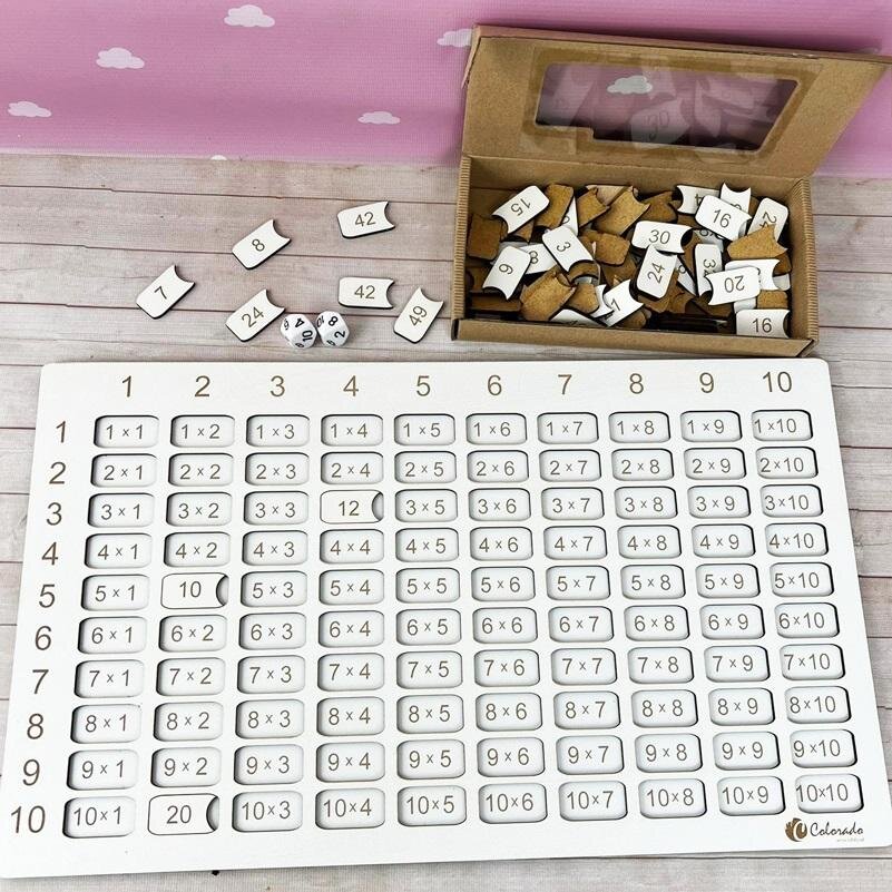 Do kompletu dołączone są dwie kostki z numerami od 1 do 10, które wprowadzają element losowości i zabawy. Dzieci mogą rzucać kostkami, a następnie znajdować i dopasowywać odpowiednie wyniki na tabliczce, co czyni naukę dynamiczną i pełną niespodzianek. Idealne dla młodych matematyków w wieku szkolnym, chcących opanować podstawy mnożenia w przyjazny i interaktywny sposób!