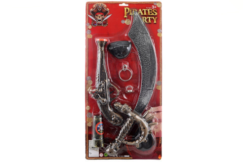 Sada pro malé piráty. Balení obsahuje pistoli, šavli, dalekohled, pásku přes oko, měšec na mince a prsten s lebkou. Materiál plast. Baleno na kartě. Rozměry balení 25x52x4 cm. Délka pistole 28 cm. Délka šavle 47 cm. Věk 3+ číst celé