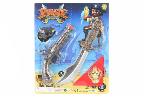 Sada pirátských zbraní Puška velikost cca 25,5 cm, mačeta cca 32 cm, šátek, odznak, plastový kryt na oko. Materiál plast. Rozměr balení 38 x 31 cm. Věk 3+ číst celé