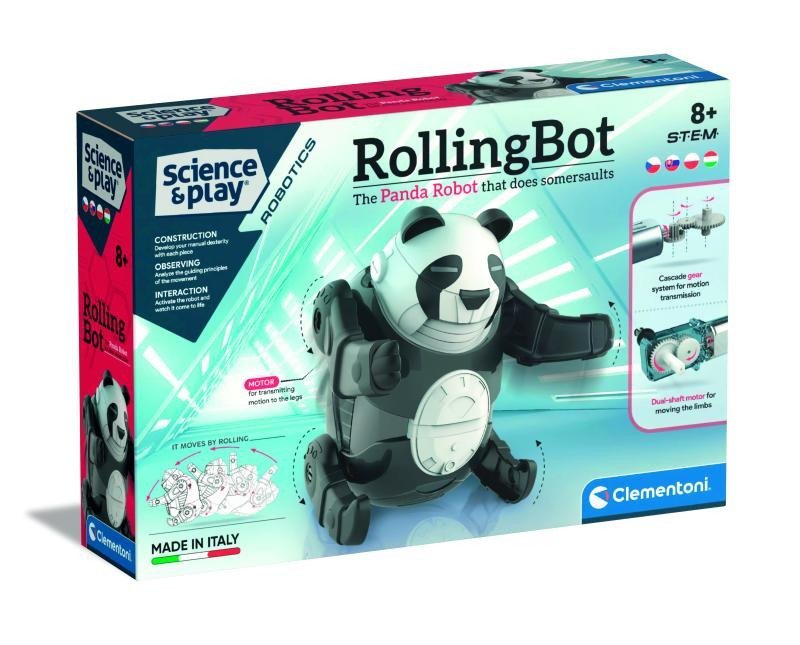 Roztomilý medvídek, kterého si děti samy sestaví, se bude následně kutálet po místnosti jako živý. Clementoni Science & Play RollingBot je robot v podobě pandy, který se pohybuje tím, že dělá kotrmelce. Tato originální vědecká sada rozvíjí manuální zručnost, logické myšlení a představivost dětí. Stavebnice obsahuje vše potřebné pro stavbu 25centimetrového medvídka provádějící legrační pohyby. Propracovaný systém dvouhřídelových motorků za pomoci kaskádového převodového systému zajišťuje motoriku všech končetin. Vědecká sada Pandabot je určena pro všechny zvídavé holky a kluky od osmi let. Klíčové vlastnosti vědecké sady s robotem Pandabot Medvídek, který se po sestavení pohybuje pomocí kotoulů Originální stavebnice rozvíjí manuální zručnost, logické myšlení a představivost dětí Clementoni Science & Play Rolling Panda obsahuje vše potřebné pro sestavení 25cm medvídka Pohyb zajišťuje systém dvouhřídelových motorků s kaskádovými převody Je třeba vložit 2 baterie AAA, které nejsou součástí Vědecká sada Pandabot je určena pro děti od 8 let