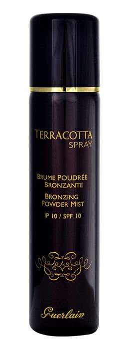 Bronzující pudr ve spreji **Guerlain Terracotta Bronzing Powder Mist Spray SPF10**. Jemný pudr Guerlain Terracotta Bronzing Powder Mist Spray SPF10 dodává pokožce přirozeně opálený vzhled. Jemná textura se snadno nanáší a ihned přilne k pokožce. Sprej zajišťuje jednotnou aplikaci bez fleků a tmavých skvrn. Během chvilky bude Váš obličej pokrytý rovnoměrnou vrstvou, která bude vypadat přirozeně. S bronzujícím pudrem ve spreji získáte přirozené opálení během chvilky. Ochranný faktor SPF10. **Účinky**: · dodává pleti přirozené opálení · rozjasňuje pokožku · chrání pleť před škodlivým slunečním zářením · kryje nedokonalosti pleti **Použití**: Aplikujte ze vzdálenosti 10 cm od obličeje. Nastříkejte na obličej, dekolt a krk. **Poznámka**: _Vyobrazený odstín může být spíše orientační, záleží na nastavení barev Vašeho monitoru._