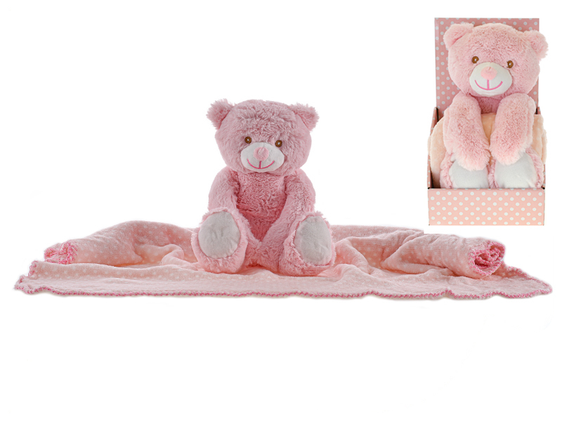 Deka pro miminko 75 x 75 cm z jemného příjemného materiálu v balení s roztomilým plyšovým medvídkem. Medvídek má rozměr 26cm. Celý set je laděný do růžové barvy. Vhodné pro holčičky.