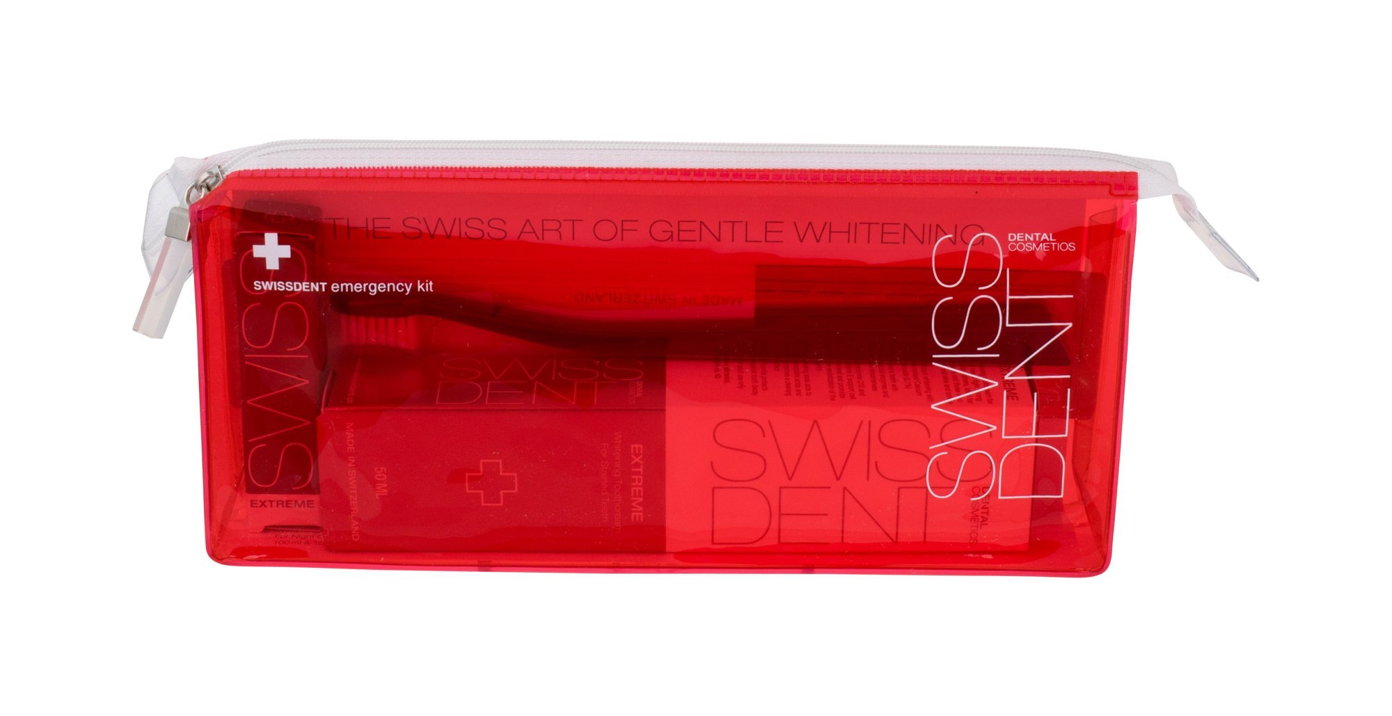 **Swissdent Extreme Whitening **kompletní sada zubní hygieny. **Složení kazety**: **Extreme Whitening Toothpaste 50 ml - Bělící zubní pasta** Účinná zubní pasta zajistí dokonale bílé zuby. Vhodné pro silné zabarvení zubů způsobené kouřením, kávou, červeným vínem apod. Odstraňuje pigmentaci ze zubů. Zubní pasta Extreme Whitening Toothpaste pečuje o zuby, zubní sklovinu i dásně. Zanechává zuby bělejší. **Obsahuje**: přírodní enzymy - odstraňují vnější pigmentace koenzym Q10 a vitamin E - pečují o dásně a revitalizují je **Extreme Mouth Spray 9 ml - Ústní sprej** Zanechává dokonele bílé zuby a svěží dech. **Soft Toothbrush- Zubní kartáček** Malá hlavice dosáhne i do nejhůře čistitelných ploch. Dokonale kopíruje tvar zubu. **Taška 1 ks**