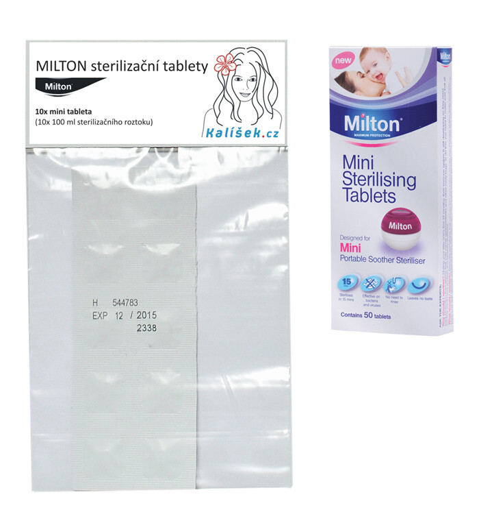 Tablety od renomovaného německého výrobce Milton účinně odstraňují bakterie a viry, čímž zajišťují optimální hygienu. Jsou vhodné nejen pro menstruační kalíšky, ale i pro dětské lahve, dudlíky či kousátka. Při použití stačí jednu tabletu rozpustit ve 100 ml studené vody, do roztoku ponořit kalíšek a po 15 minutách je sterilizace hotová. Následné opláchnutí čistou vodou dokonale připraví váš kalíšek na další použití.